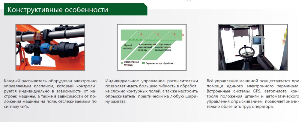 Инновационная машина, предназначенная для обработки полей большой площади. Индивидуально управляемые клапаны распылителей, гидравлический автопилот, система поддержания высоты штанги, умное электронное управления основными системами машины наряду с высочайшей топливной экономичностью выгодно отличают данный опрыскиватель.